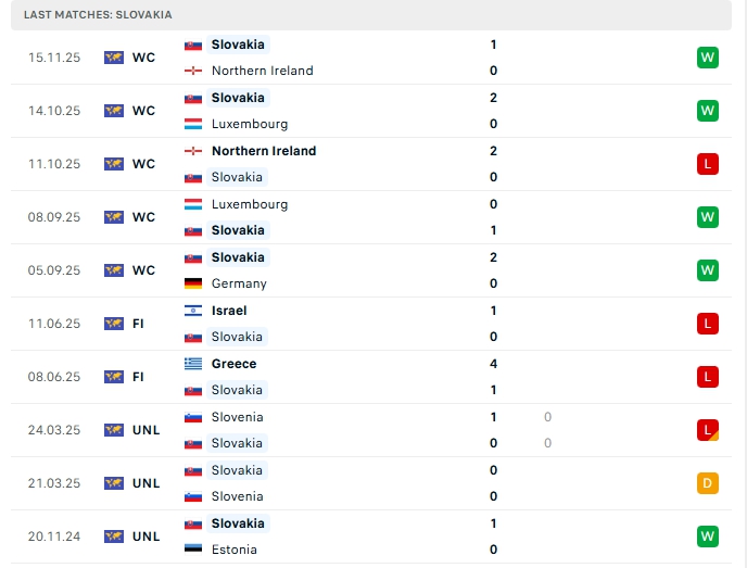 Slovakia sau 5 trận đấu hàng công đội bóng này mang về 6 bàn thắng cùng hàng thủ nhận 2 bàn thua, lối chơi của Slovakia thiên về phòng ngự, cả 5 trận gần nhất của Slovakia khép lại không quá 2 bàn thắng, khi thi đấu xa nhà ở 4/5 trận cũng có kết quả tương tự.