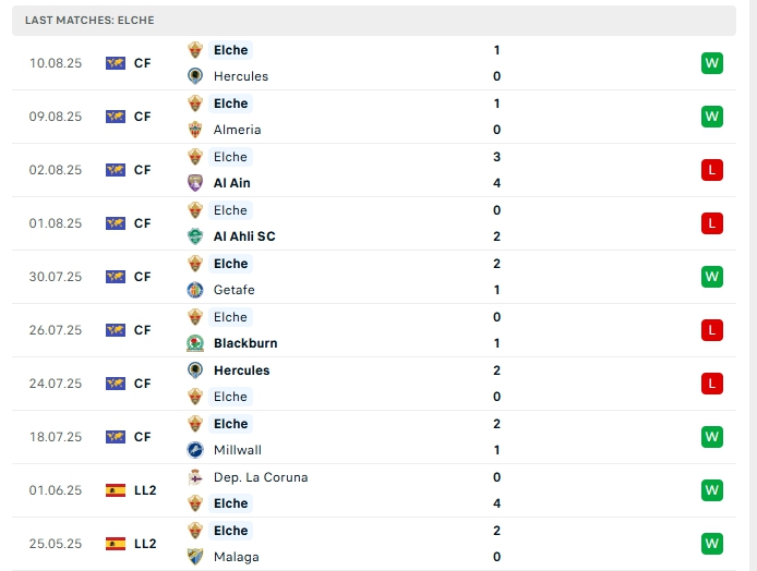 Elche là tân binh ở Laliga mùa giải năm nay, họ kết thúc mùa giải ở vị trí thứ 2 tại Segunda División, giành vé thăng hạng, đánh dấu lần thứ bảy đội bóng trở lại giải đấu cao nhất Tây Ban Nha, mùa giải vừa qua họ ghi 59 bàn, thủng lưới 34 bàn, để chuẩn bị cho mùa giải mới, Elche mang về 8 trận giao hữu, trong đó hàng công có được 9 bàn thắng cùng hàng thủ nhận 11 bàn thua, 5/8 trận đấu đó đều về xỉu và 3/5 trận trên sân nhà cũng tương tự.