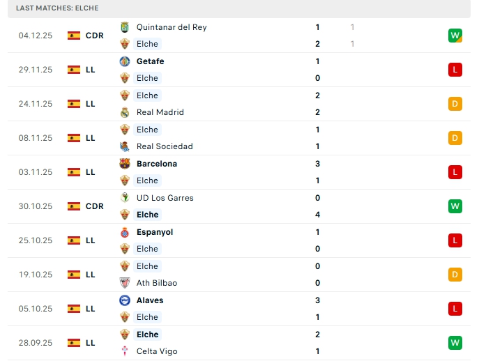 Elche sau 14 vòng đấu, hàng công của đội bóng này mang về 15 bàn thắng cùng hàng thủ nhận 17 bàn thua, 3/5 trận gần nhất ở đấu trường Laliga của Elche khép lại 90 phút không quá 2 bàn thắng, trên sân nhà của mình ở 3/5 trận gần nhất cũng khép lại với kết quả tương tự.