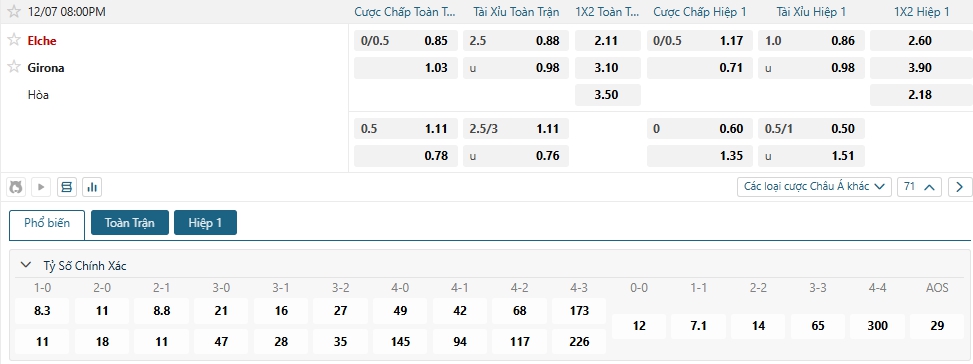 Nhà cái châu Âu đang đánh giá cao khả năng chiến thắng của Elche là cao hơn so với đối thủ khi đưa ra mức tỷ lệ là 2.11 và các cầu thủ khách là 3.10, Elche có ưu thế sân bãi , sở hữu thực lực được đánh giá cao hơn, cùng phong độ ấn tượng trên sân nhà, trong khi Girona đang chơi tệ, lựa chọn Girona ở kèo châu Á.