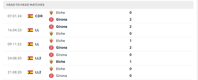Những màn đụng độ giữa Elche và Girona thường diễn ra chặt chẻ với ít bàn thắng được tạo ra, cụ thể ở 4/5 lần gặp nhau gần nhất của hai đội và 4/5 lần đón tiếp Girona trên sân của Elche khép lại không quá 2 bàn thắng.