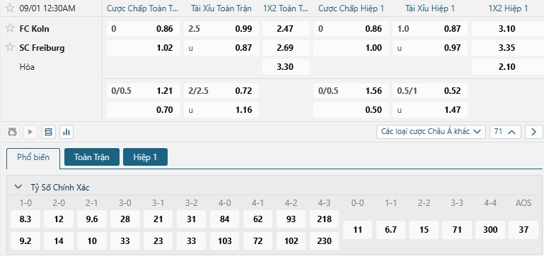 Bảng tỷ lệ kèo bóng đá trận đấu FC Koln vs Freiburg