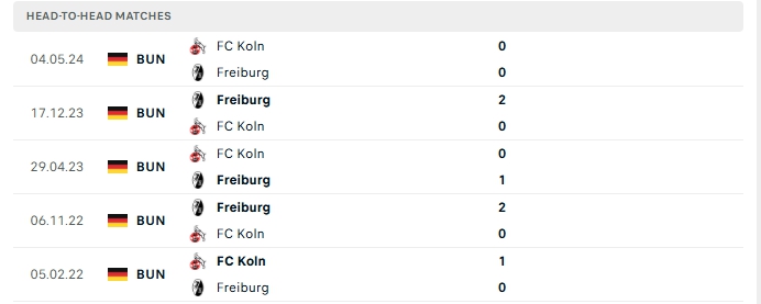 Những màn đụng độ giữa FC Koln và Freiburg thường diễn ra chặt chẻ với ít bàn thắng được tạo ra, cụ thể ở cả 5 lần gặp nhau gần nhất và 3/5 lần đón tiếp Freiburg trên sân của FC Koln khép lại không quá 2 bàn thắng.