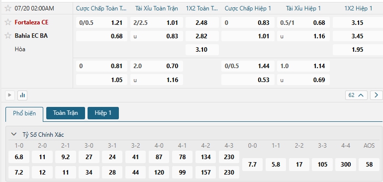 Bảng tỷ lệ kèo bóng đá trận đấu Fortaleza vs Bahia