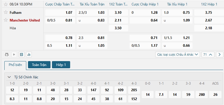 Nhà cái châu Á đang đánh giá cao khả năng chiến thắng của các vị khách Man Utd, khi đưa ra mức chấp đang là 0.25, dù có ưu thế sân nhà nhưng Fulham lại không được đánh giá cao khi họ thua kém Man utd về thực lực cùng với lịch sử đối đầu, Man utd đang tự tin hướng đến chiến thắng và nhiều khả năng quỷ đỏ sẻ có được 3 điểm đầu tay, lựa chọn Man Utd cho kèo châu Á.