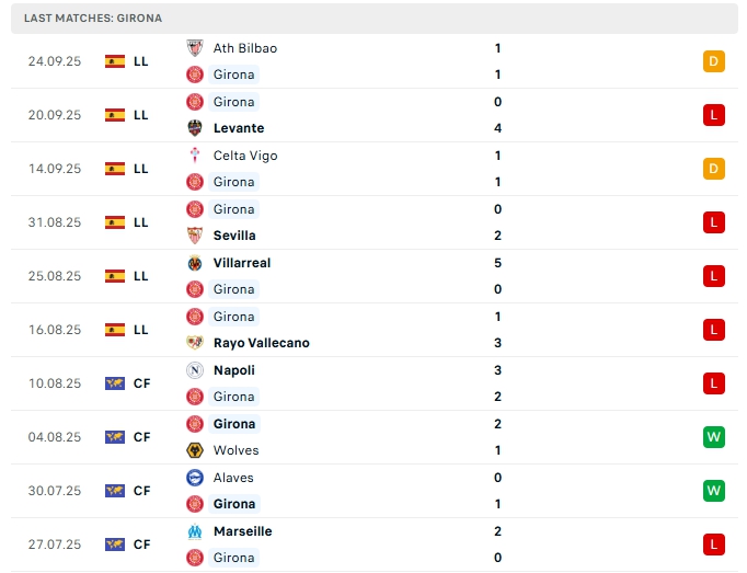 Girona ở 6 trận đấu đầu tiên họ mang về 2 trận hòa và 4 thất bại, có được 2 điểm, xếp ở vị trí cuối cùng trên BXH, ở ngày ra quân họ thất bại 0-5 trước Villarreal, sau đó là thất bại 0-2 trước Girona, Girona đang trải qua chuỗi 5 trận không thắng liên tiếp, phong độ tệ hại khiến họ gặp khó, trên sân nhà Girona cũng toàn thua ở 3 trận gần nhất.