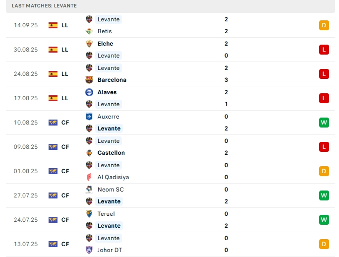 Levante ở 4 vòng đấu đầu tiên, hàng công mang về 5 bàn thắng cùng hàng thủ nhận 9 bàn thua, 3/4 trận vừa qua của Levante khép lại từ 3 bàn trở lên, khi thi đấu xa nhà ở 2 trận gần nhất, hàng công Levante mang về 1 bàn thắng nhưng hàng thủ nhận 4 bàn thua, hàng thủ chơi tệ cũng khiến Levante đang gặp khó.