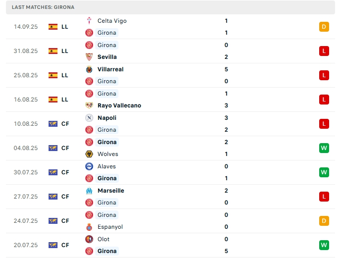 Girona sau 4 vòng đấu, hàng công của đội bóng này mang về 2 bàn thắng cùng hàng thủ nhận chơi tệ khi nhận 11 bàn thua, 2 trận gần nhất của Girona đều khép lại không quá 2 bàn thắng, việc hàng công chơi tệ và hàng thủ thiếu chắc chắn khiến Girona đang gặp nhiều khó khăn.