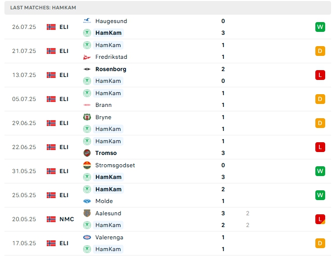 HamKam ở vòng đấu gần nhất họ có chiến thắng 3-0 trước Haugesund, chiến thắng này chấm dứt chuỗi 4 trận không biết đến mùi chiến thắng trước đó, sau 15 trận đấu cùng với 4 chiến thắng, 5 hòa và 6 thất bại có được 17 điểm và đang xếp vị trí thứ 14 trên BXH, trên sân nhà của mình  Hamkam đang chơi không tốt khi chỉ thắng 1, hòa 3 và thua 1 ở 5 trận vừa qua.