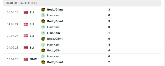 Lịch sử đối đầu của HamKam vs Bodo Glimt