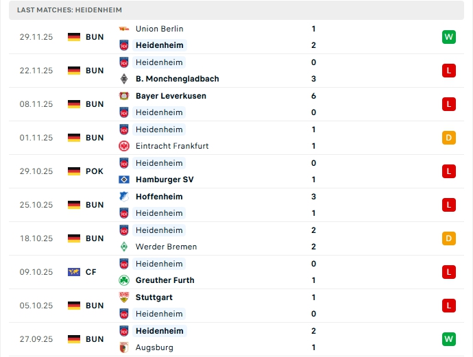 Heidenheim sau 12 trận đấu, đội bóng này mang về 2 chiến thắng, 2 hòa cùng 8 thất bại, có được 8 điểm và đang xếp vị trí thứ 16 trên BXH, một vị trí trong nhóm cầm đèn đỏ, phong độ thời gian qua của Heidenheim là không tốt, dù vừa có được chiến thắng, nhưng đây là chiến thắng đầu tiên sau 9 trận gần nhất,  trên sân nhà Heidenheim cũng chơi tệ khi thua 3, hòa 2 ở 5 trận gần nhất.