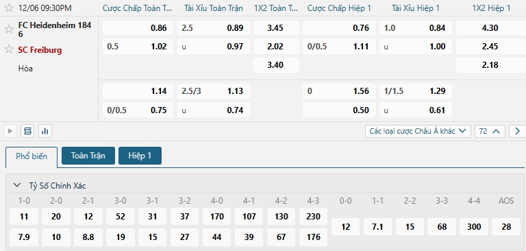 Bảng tỷ lệ kèo bóng đá trận đấu Heidenheim vs Freiburg