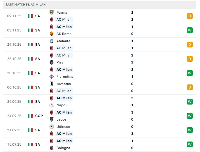 AC Milan sau 11 trận đấu, đội bóng này mang về 17 bàn thắng cùng hàng thủ nhận 9 bàn thua, 3/5 trận gần nhất của AC Milan khép lại trên 3 bàn, khi thi đấu xa nhà ở 5 trận gần nhất thì có 3 trận họ đều để các đối thủ chọc thủng lưới.