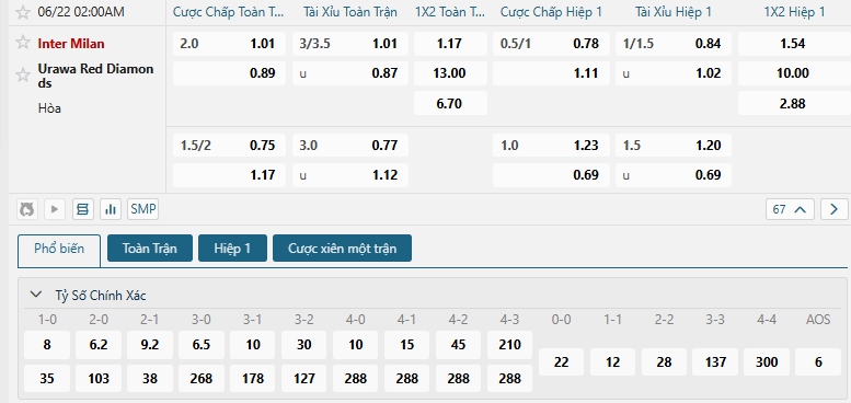 Bảng tỷ lệ kèo bóng đá trận đấu Inter Milan vs Urawa Red