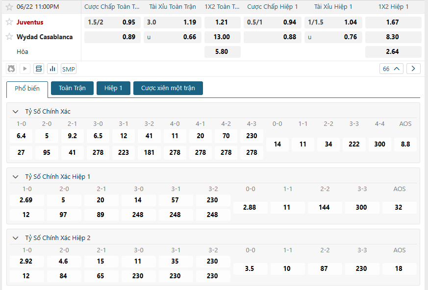 Bảng tỷ lệ kèo bóng đá trận đấu Juventus vs Wydad Casablanca