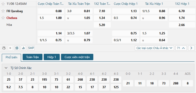 Bảng tỷ lệ kèo bóng đá trận đấu Karabakh Agdam vs Chelsea