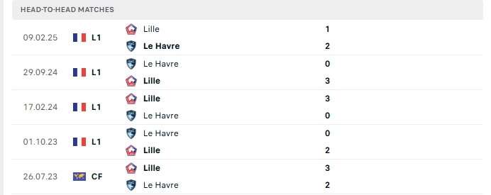 Lịch sử đối đầu của Le Havre vs Lille
