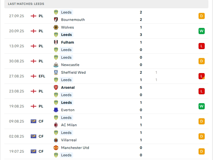 Leeds Utd ở vòng đấu vừa qua họ có trận hòa 2-2 trước Bournemouth, đây là trận thứ 2 liên tiếp bất bại, trước đó Leeds Utd có chiến thắng trước 3-1 trước Wolves, sau 6 trận đấu Leeds Utd có cho mình 2 chiến thắng, 2 hòa và 2 thất bại, có được 8 điểm và đang xếp vị trí thứ 12 trên BXH, phong độ thời gian qua của Leeds Utd là không quá ổn định, dù vậy trên sân nhà của mình Leeds đang có chuỗi 12 trận bất bại liên tiếp.