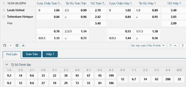 Bảng tỷ lệ kèo bóng đá trận đấu Leeds Utd vs Tottenham
