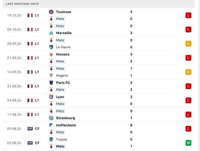 Metz sau 8 trận đấu hàng công đội bóng này mang về 5 bàn thắng, bên cạnh hàng thủ nhận 20 bàn thua, hàng thủ đang là điểm yếu của Metz, họ cần sớm cải thiện nếu không muốn tiếp tục lún sâu, khi xa nhà Metz thường chơi với số đông cầu thủ bên phần sân nhà, dù vạy hàng thủ tệ thường khiến họ bị các đối thủ dễ dàng đánh bại.