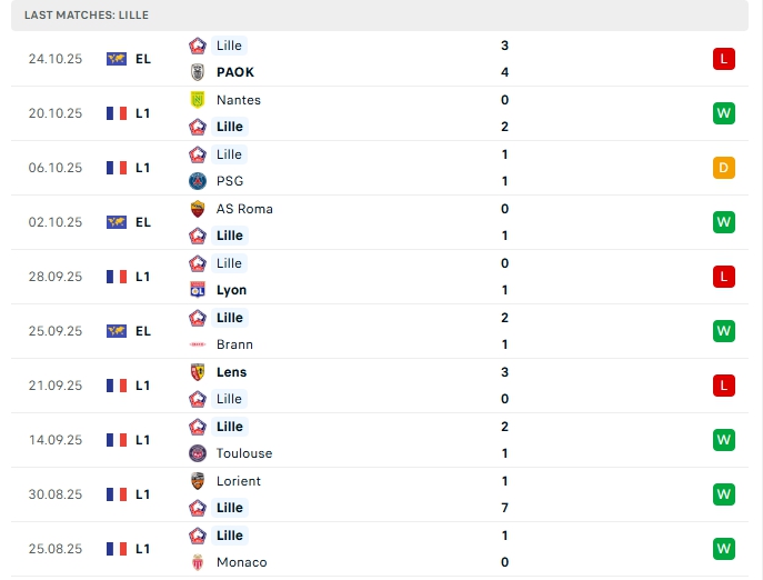 Lille sau 8 trận đấu họ có được 4 chiến thắng và 2 hòa và 2 thất bại, mang về 14 điểm và đang xếp ở vị trí thứ 6 trên BXH, Lille vừa nhận thất bại 3-4 trước Paok ở sân chơi Europa League, thất bại này chấm dứt chuỗi 3 trận bất bại trước đó với 2 chiến thắng cùng 1 hòa, phong độ thời gian qua của Lille là khá tốt, trên sân nhà họ mang về 2 chiến thắng, 1 hòa và chỉ 1 thất bại sau 4 trận đấu.