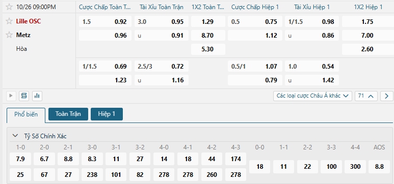 Bảng tỷ lệ kèo bóng đá trận đấu Lille vs Metz