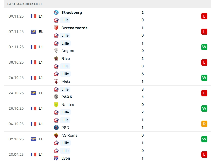 Lille sau 12 lượt trận đầu tiên, hàng công của đội bóng này mang về 23 bàn thắng có được cùng hàng thủ nhận 15 bàn thua, 4/5 trận vừa qua ở đấu trường Ligue 1 của Lille khép lại không quá 2 bàn thắng, trên sân nhà của mình ở 3/5 trận gần nhất cũng có kết quả tương tự.