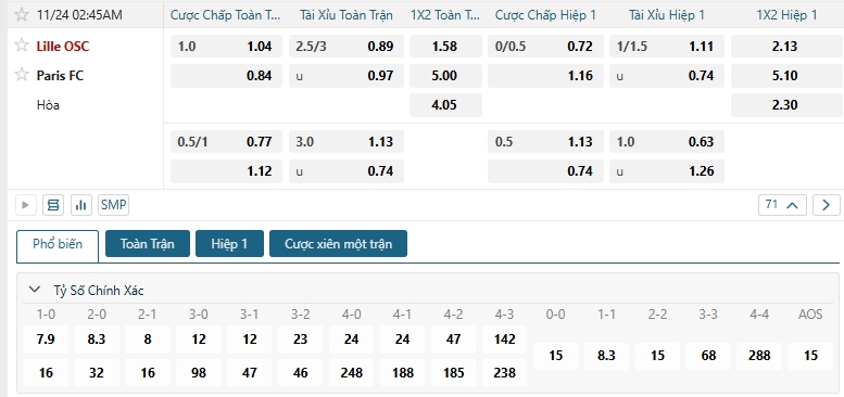 Bảng tỷ lệ kèo bóng đá trận đấu Lille vs Paris FC