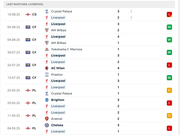 Liverpool là nhà ĐKVĐ mùa giải trước, họ bước vào mùa giải năm nay vơi quyết tâm bảo vệ ngôi vương, để chuẩn bị cho mùa giải mới The Kop có cho mình những trận đấu giao hữu ấn tượng, hàng công của Liverpool mang về 15 bàn thắng, cùng hàng thủ nhận 9 bàn thua, cả 5 trận đấu đó của The Kop đều vượt mốc trên 3 bàn, 4/5 trận vừa qua trên sân nhà của Liverpool cũng vượt mốc trên 3 bàn.