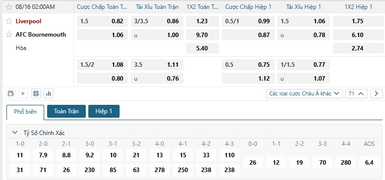 Bảng tỷ lệ kèo bóng đá trận đấu Liverpool vs Bournemouth