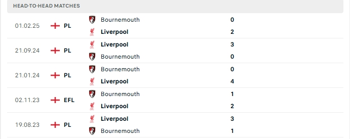 Lịch sử đối đầu của Liverpool vs Bournemouth