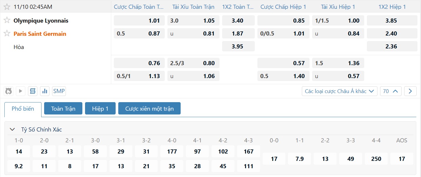 Tỷ lệ hiệp 1 PSG chấp 0.25, odd cửa trên 1.01 – đây là kèo khá “nhạy”. Đội khách thường nhập cuộc chậm, trong khi Lyon lại hay chơi bùng nổ đầu trận khi có khán giả nhà. Khả năng cao PSG sẽ phải chờ đến hiệp hai mới định đoạt..