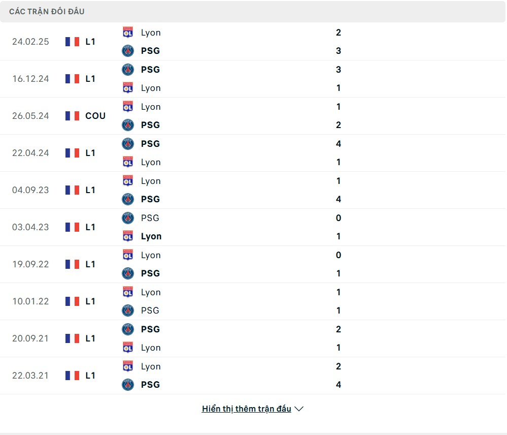 Lịch sử đối đầu của Lyon vs PSG
