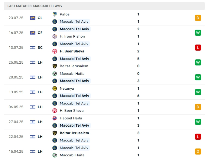 Phong độ gần đây Maccabi Tel Aviv vs Pafos