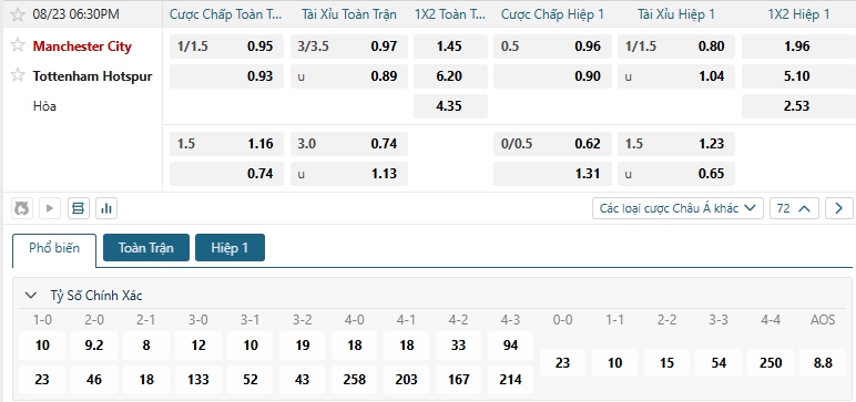 Bảng tỷ lệ kèo bóng đá trận đấu Man City vs Tottenham