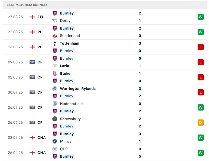 Burnley ở 2 lượt trận đầu tiên đội bóng này có được 2 bàn thắng cùng hàng thủ nhận 3 bàn thua, lối chơi của Burnley thiên vệ sự chặt chẻ nơi hàng thủ và chờ đợi thời cơ phản công, việc hàng công thi đấu không tốt cùng hàng thủ chơi tệ khiến họ đang gặp nhiều khó khăn.
