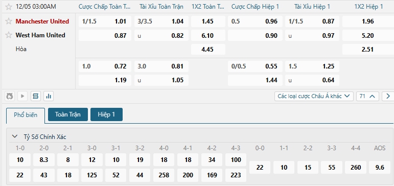 Nhà cái châu Á đang đánh giá cao khả năng chiến thắng của Man Utd là cao hơn so với West Ham Utd, khi đưa ra mức chấp đang là 1.25, được thi đấu trên sân nhà và sở hữu thực lực được đánh giá cao, Man Utd được đánh giá cao hơn và sẻ hướng đến chiến thắng cho mình,  West Ham sở hữu lối chơi khó chịu, sẻ đem đến nhiều khó khăn cho Man Utd, dù vậy họ khó lòng có được kết quả tốt khi ra về, 2/3 chiến thắng gần nhất trước đối thủ là những chiến thắng cách biệt, lựa chọn Man Utd cho kèo Châu Á.