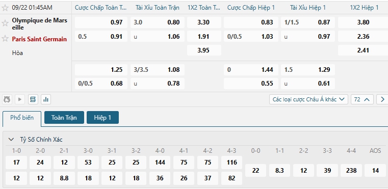 Bảng tỷ lệ kèo bóng đá trận đấu Marseille vs PSG