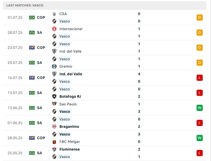 Vasco sau 15 trận đấu hàng công của đội bóng này mang về 16 bàn thắng cùng hàng thủ nhận 20 bàn thua, 4/5 trận vừa qua của đội bóng này khép lại không quá 2 bàn thắng, 2 trận gần nhất xa nhà của họ cũng khép lại với kết quả tương tư, hàng công đang gặp nhiều khó khăn ở khâu ghi bàn khiến họ gặp khó.