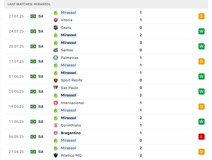 Mirassol sau 15 trận đấu họ mang về 24 bàn thắng cùng với hàng thủ nhận 14 bàn thua, lối chơi của đội bóng này thiên về phòng ngự số đông, 4/5 trận gần nhất của họ khép lại 90 phút không quá 2 bàn và 2/3 trận trên sân nhà vừa qua cũng tương tự.