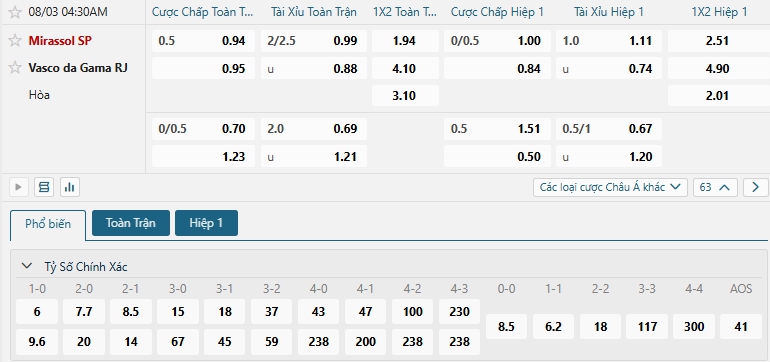 Nhà cái châu Âu đang đánh giá khả năng chiến thắng của các cầu thủ chủ nhà Mirassol là cao hơn so với Vasco khi đưa ra mức tỷ lệ cho Mirassol là 1.94 và các cầu thủ khách Vasco là 4.10, Chênh lệch là đủ lớn để đặt niềm tin vào Mirassol trong trận đấu này khi họ sở hữu ưu thế cùng phong độ ấn tượng, trong khi Vasco ngược lại, lựa chọn Mirassol cho kèo Châu Âu.