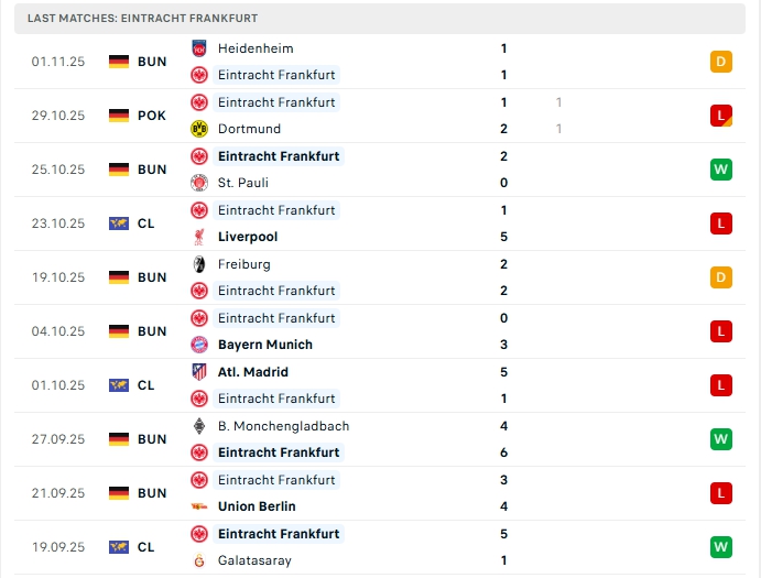Bên kia sân, Eintracht Frankfurt họ vừa nhận trận hòa trước Heidenheim ở đấu trường quốc nội, ở sân chơi Champions League sau 3 lượt trận Eintracht Frankfurt có được 3 điểm với 1 chiến thắng cùng 2 thất bại, và đang xếp vị trí thứ 22 trên BXH, họ để thua trước Atletico Madrid và Liverpool dù ở ngày ra quân có chiến thắng trước Galatasaray, phong độ thời gian qua của Eintracht Frankfurt là không tốt, đặc biệt khi xa nhà họ chỉ thắng 1 ở 5 trận gần nhất, trong đó có 2 hòa cùng 2 thất bại.