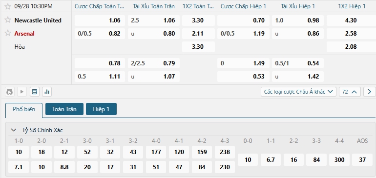 Bảng tỷ lệ kèo bóng đá trận đấu Newcastle vs Arsenal