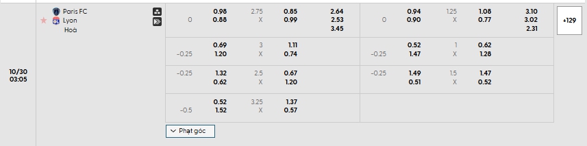 Bảng tỷ lệ kèo bóng đá trận đấu Paris FC vs Lyon