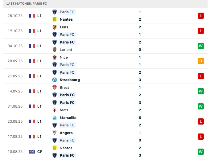 Paris FC ở vòng đấu gần nhất họ nhận thất bại 1-2 trước Nantes, đây là thất bại thứ 2 liên tiếp của đội bóng này, sau 9 trận đấu với 3 chiến thắng, 1 hòa cùng với 5 thất bại, thì Paris FC đang có được 10 điểm, xếp vị trí thứ 11 trên BXH, phong độ thời gian qua của Paris FC là không tốt, đội bóng này chỉ thắng 1 ở 5 trận gần nhất, trên sân nhà của mình Paris FC cũng đang chơi thiếu ổn định,
