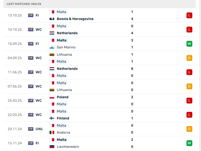 Bên kia sân, Malta sau 6 lượt trận, đội bóng này có được 2 hòa cùng 4 thất bại, có được 2 điểm và đang xếp vị trí cuối cùng trên BXH, ở trận gần nhất Malta nhận thất bại 0-4 trước Hà Lan, ở trận giao hữu gần nhất Malta nhận thất bại trước Bosnia & Herzegovina, phong độ thời gian qua của Malta là không tốt, phong độ xa nhà vừa qua của Malta là không tốt họ thua 3, hòa 1 và chỉ thắng 1 ở 5 trận gần nhất.