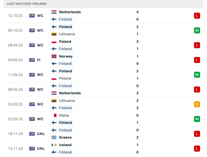 Phần Lan sau 7 lượt trận họ mang về 3 chiến thắng, 1 hòa cùng 3 thất bại, có được 10 điểm và đang xếp vị trí thứ 3 trên BXH, ở vòng đấu gần nhất Phần Lan nhận thất bại 0-4 trước Hà Lan, đây là thất bại thứ 3 của họ sau 4 trận đấu, phong độ thời gian qua của Phần Lan là không tốt, họ chỉ thắng 1 thua 3 ở 4 trận vừa qua, trên sân nhà Phần Lan có 2 chiến thắng liên tiếp gần nhất.