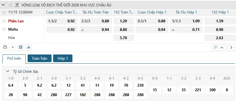 Bảng tỷ lệ kèo bóng đá trận đấu Phần Lan vs Malta