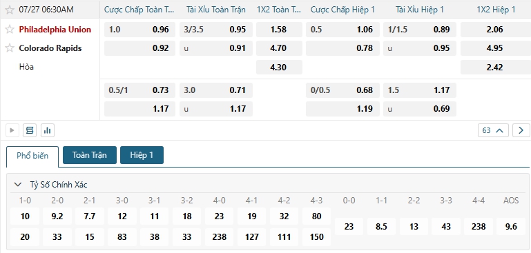 Bảng tỷ lệ kèo bóng đá trận đấu Philadelphia Union vs Colorado Rapids
