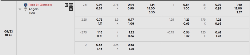 Nhà cái châu Á đang đánh giá cao khả năng chiến thắng của chủ nhà PSG là cao hơn so với Angers, khi đưa ra mức chấp đang là 2.5, sự vượt trội về phong độ, chất lượng đội hình cùng với đó là ưu thế sân bãi thì PSG hứa hẹn là những người kiểm soát thế trận và hướng đến chiến thắng, thậm chí là chiến thắng đậm trên sân nhà của mình. Lựa chọn PSG cho kèo châu Á.